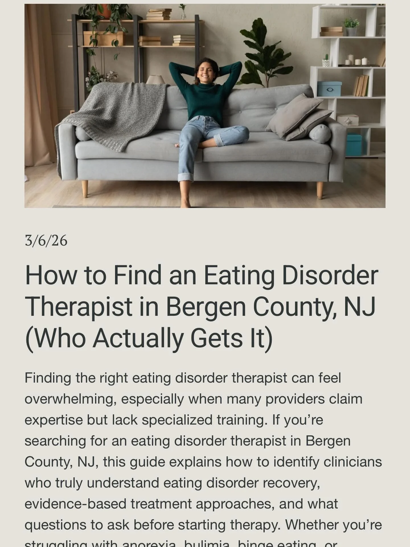 Maybe you've been struggling with anorexia, bulimia, binge eating disorder, or ARFID for years and you've had therapy before, but it didn't really touch what was happening underneath. Maybe you've been told to 'just eat' or 'love your body' and you know, rationally, that's not how any of this works. Maybe you're a parent in Bergen County watching your teenager disappear into restriction and you don't know where to turn.